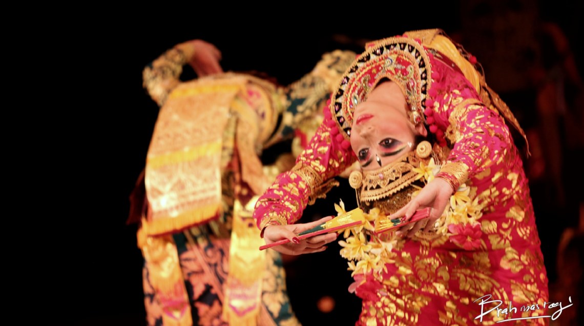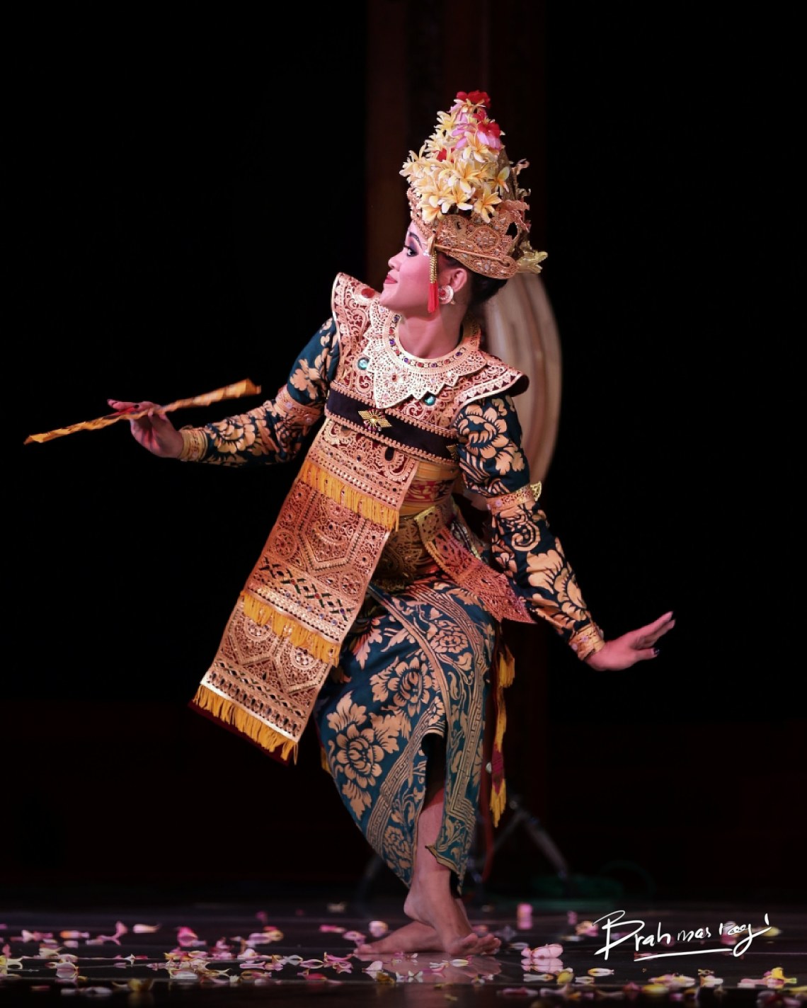 Legong Lasem or Kraton Dance, this is classical dance, which is usually staged in the palace courtyard to entertain the king. Three girl dancers in colorful costumes perform it. Classical Legong enacts several traditional stories. The most common is the tale of the King of Lasem from the Malat, a collection of heroic romances. He is at war with another king, the father (or brother) of Princess Ranjasari. Lasem wants to marry the girl, but she detests him and tries to run away. Becoming lost in the forest, she is captured by Lasem, who imprisons her and goes out for a final assault against her family. He is attacked by a monstrous raven, which foretells his death. (source http://www.balerungbali.com)