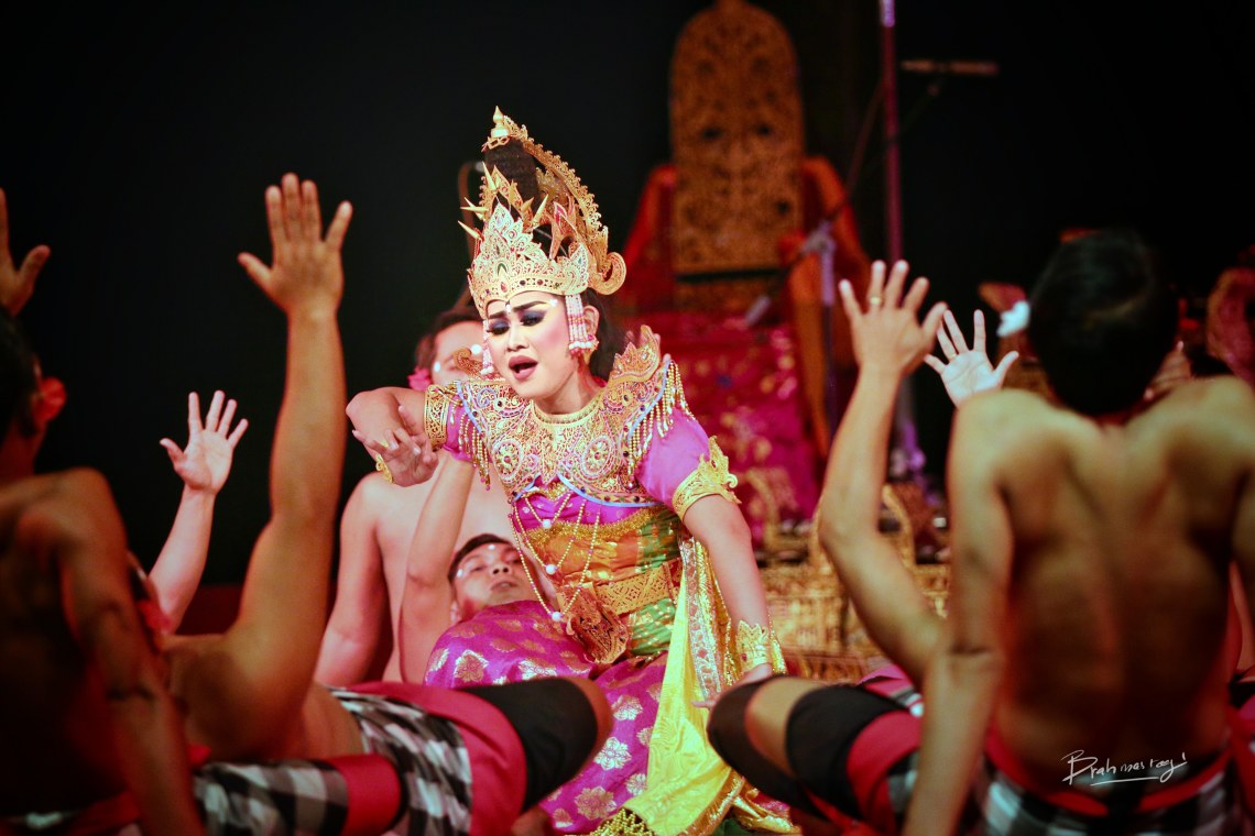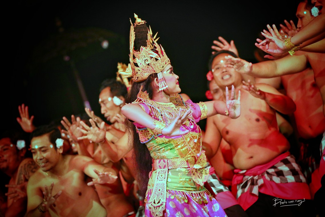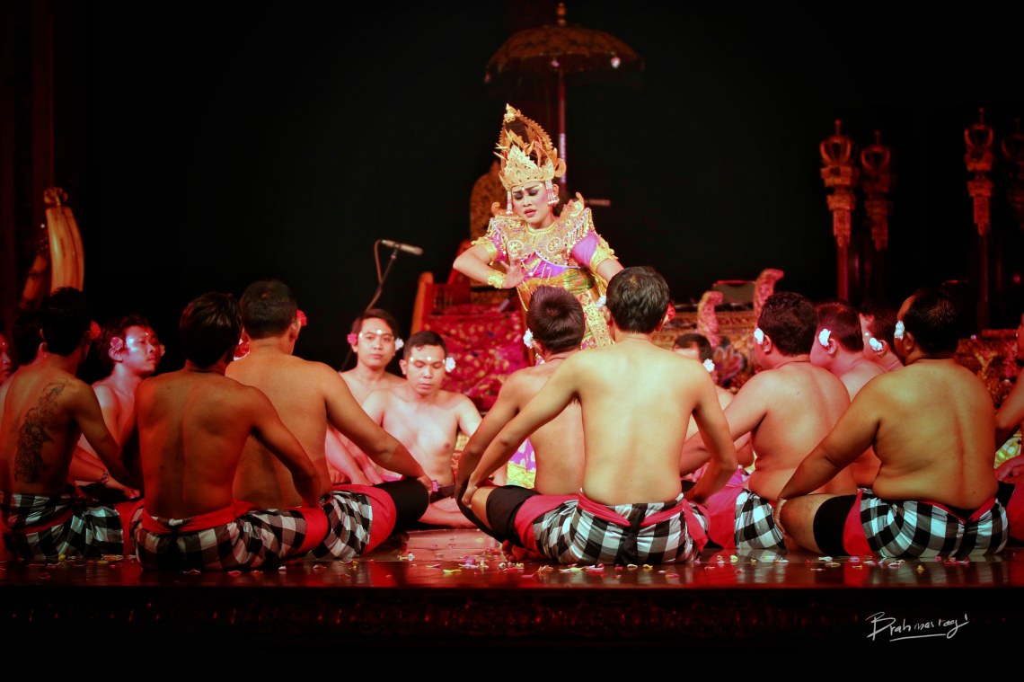 Kecak (pronounced [ˈketʃaʔ] (“Kechak”), alternate spellings: Kechak and Ketjak), known in Indonesianas Tari Kecak, is a form of Balinese hindu dance and music drama that was developed in the 1930s in Bali, Indonesia. Since its creation it has been performed primarily by men, with the very first women’s kecak group starting in 2006.[1] The dance mainly plays about the Ramayana and is traditionally performed in temples and villages across Bali.