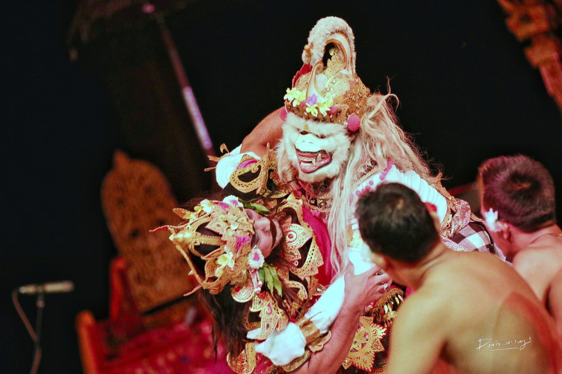 Also known as the Ramayana Monkey Chant, the piece, performed by a circle of at least 150 performers wearing checked cloth around their waists, percussively chanting “chak” and moving their hands and arms, depicts a battle from the Ramayana. The monkey-like Vanara led by Hanuman helped Prince Rama fight the evil King Ravana. Kecak has roots in sanghyang, a trance-inducing exorcismdance.[2]